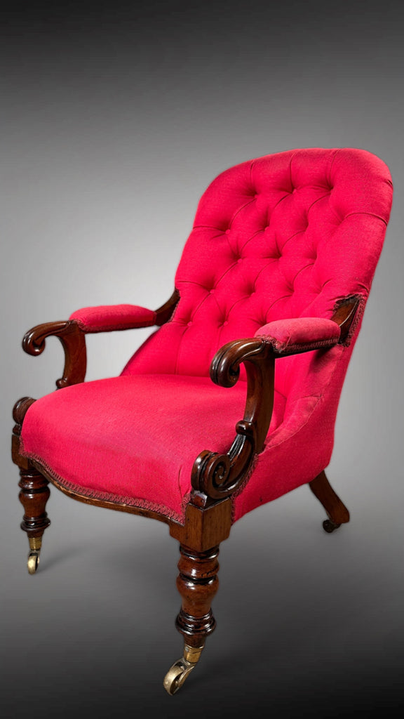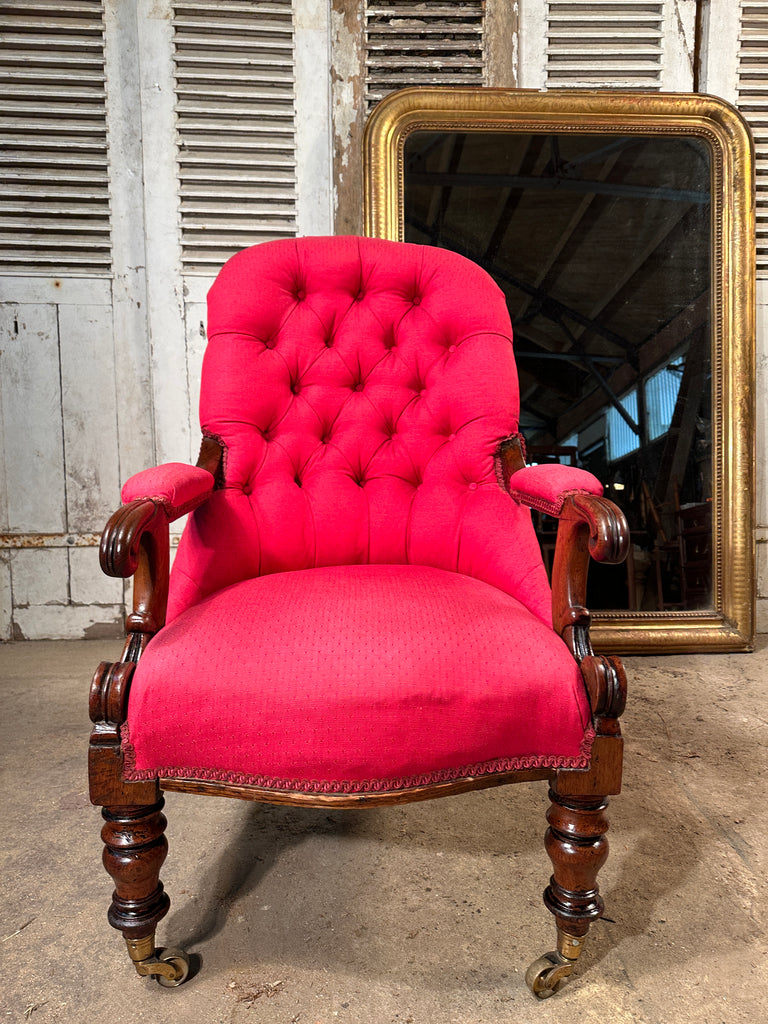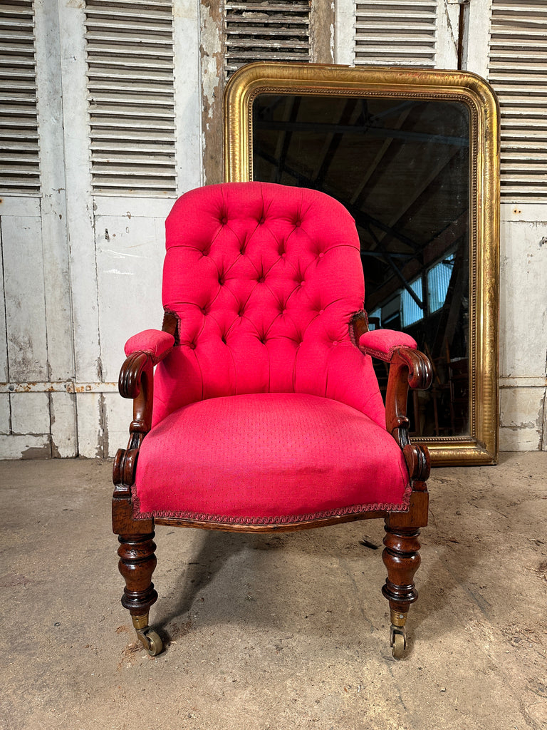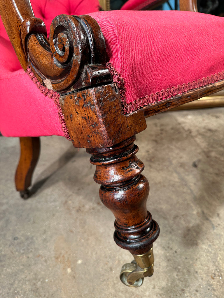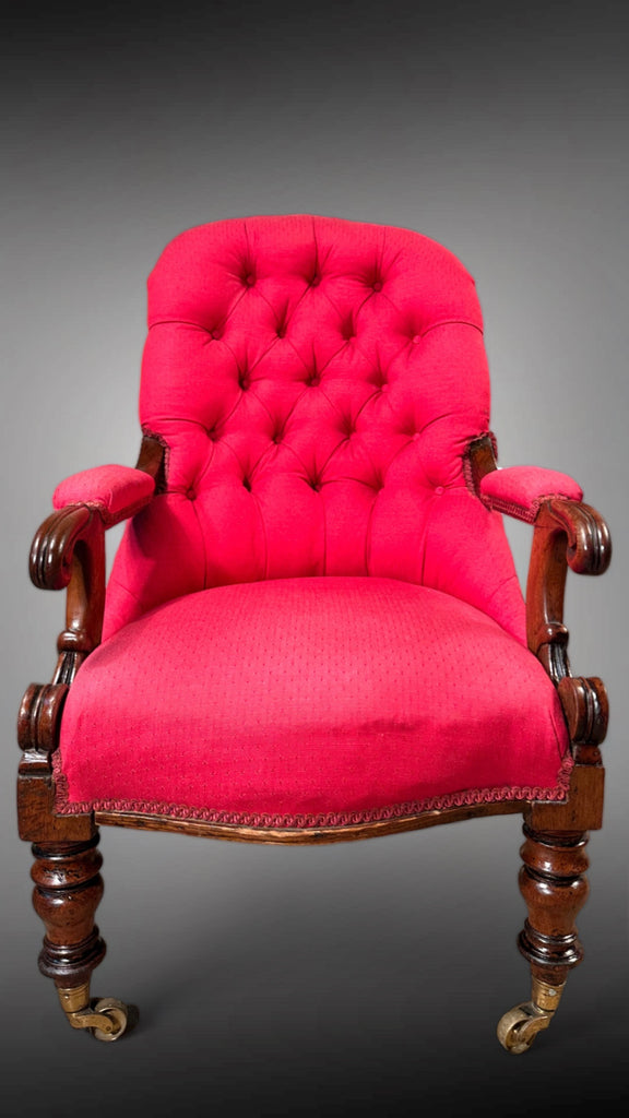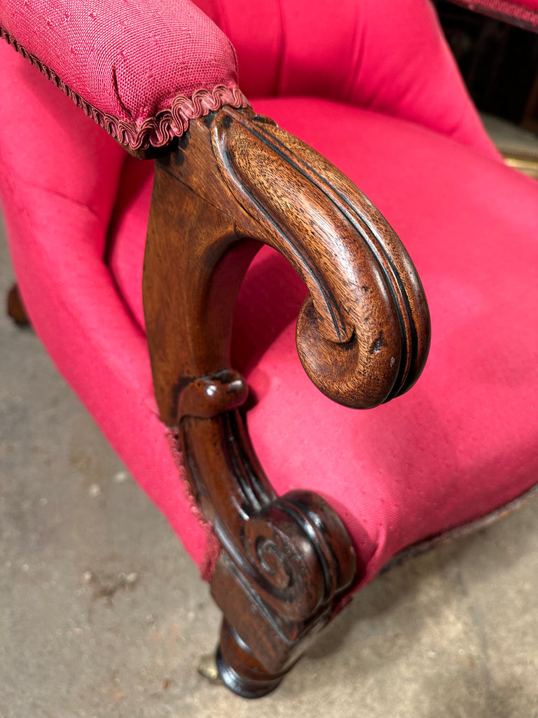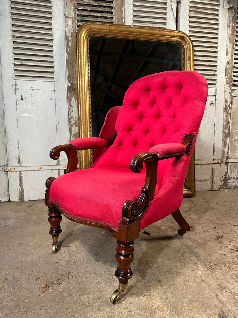 An antique Country House mahogany button back showframe armchair with fabulous red/pink upholstery/fabric. Dating from circa 1870 with original brass castors. Beautiful hand carved turned arms and swept back detailing to frame. Fabulous carved legs with original brass inset castors. This armchair has the look and is all original.