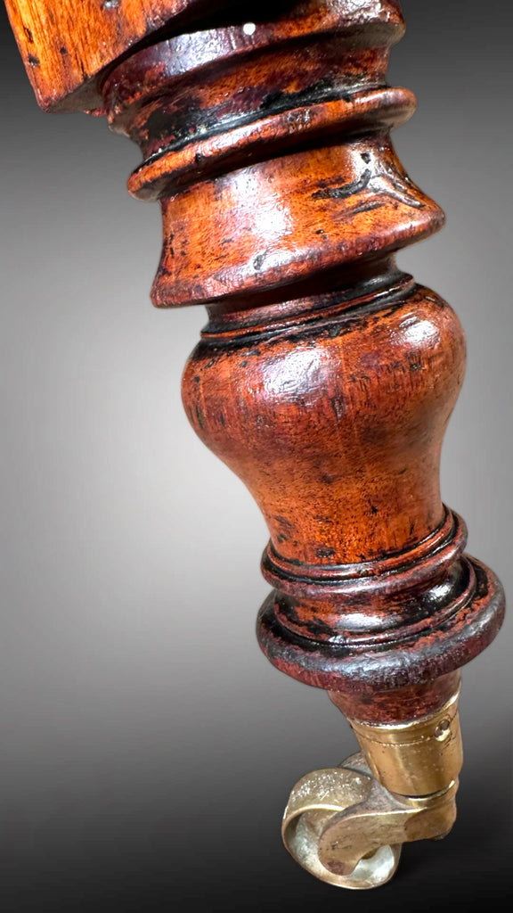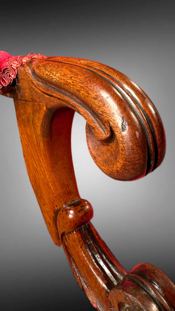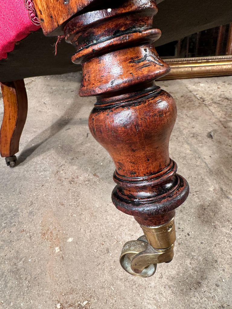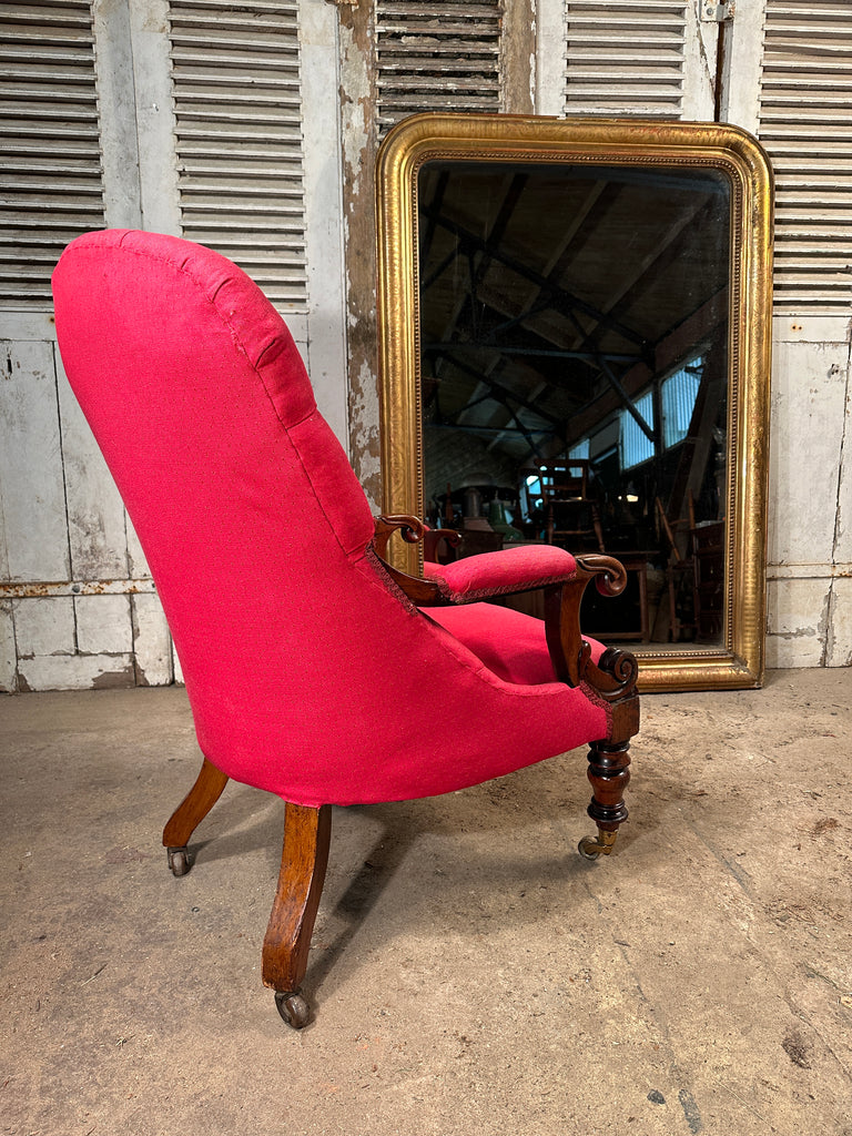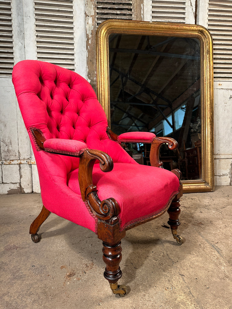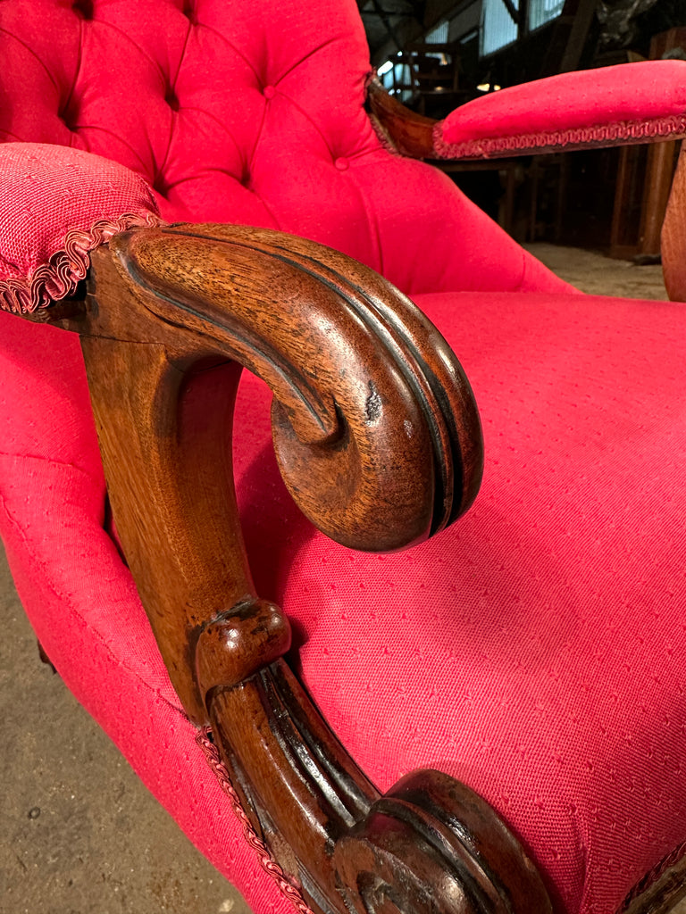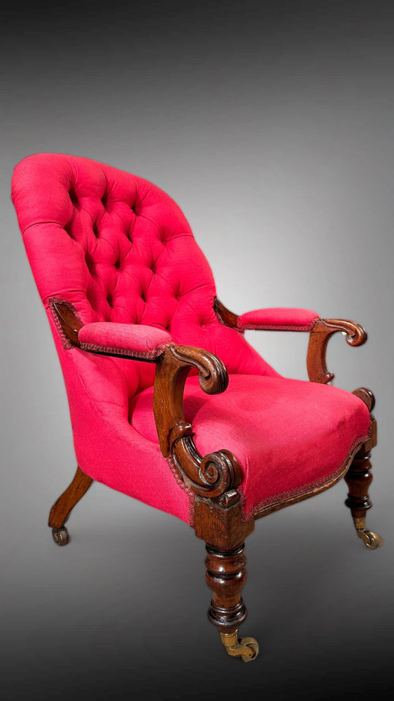 An antique Country House mahogany button back showframe armchair with fabulous red/pink upholstery/fabric. Dating from circa 1870 with original brass castors. Beautiful hand carved turned arms and swept back detailing to frame. Fabulous carved legs with original brass inset castors. This armchair has the look and is all original.