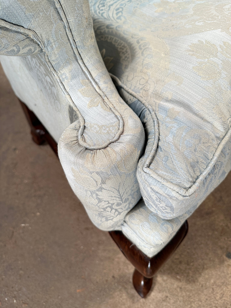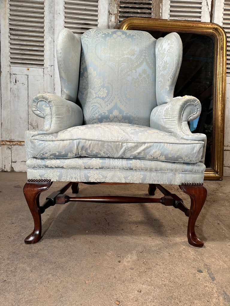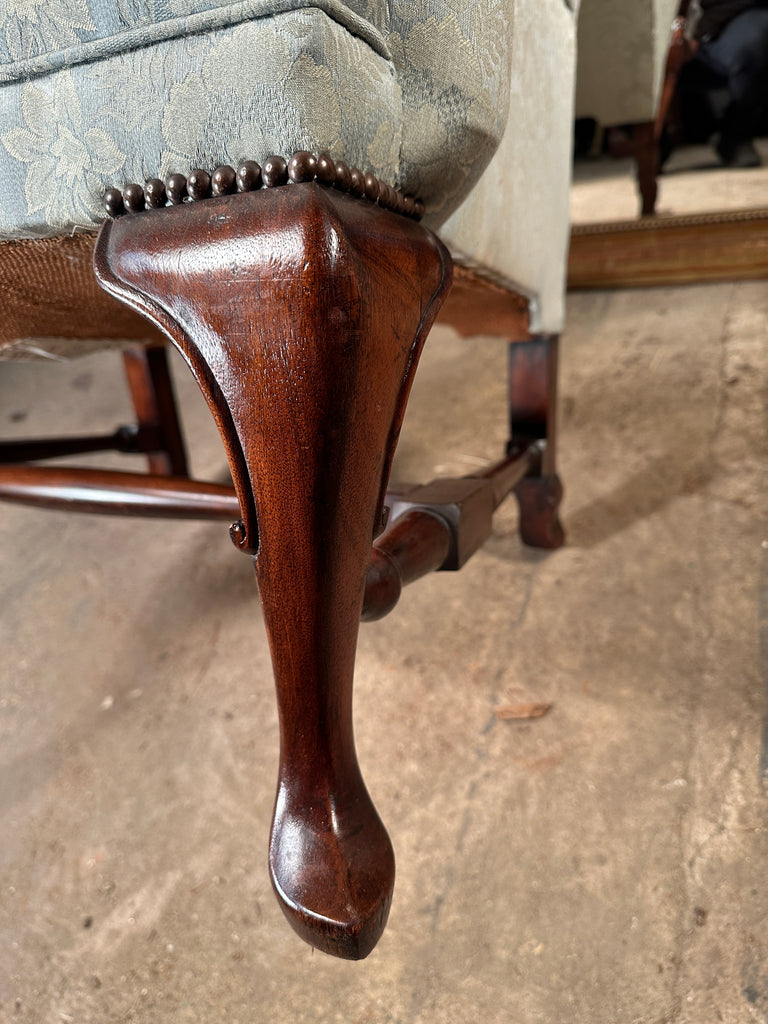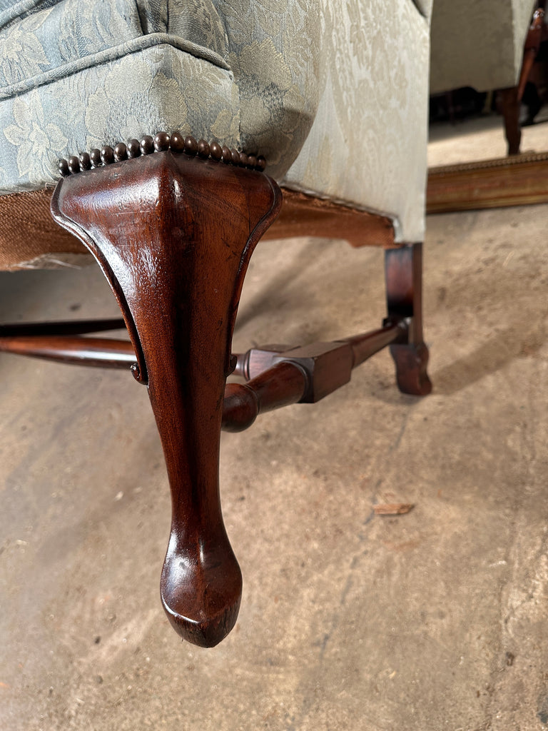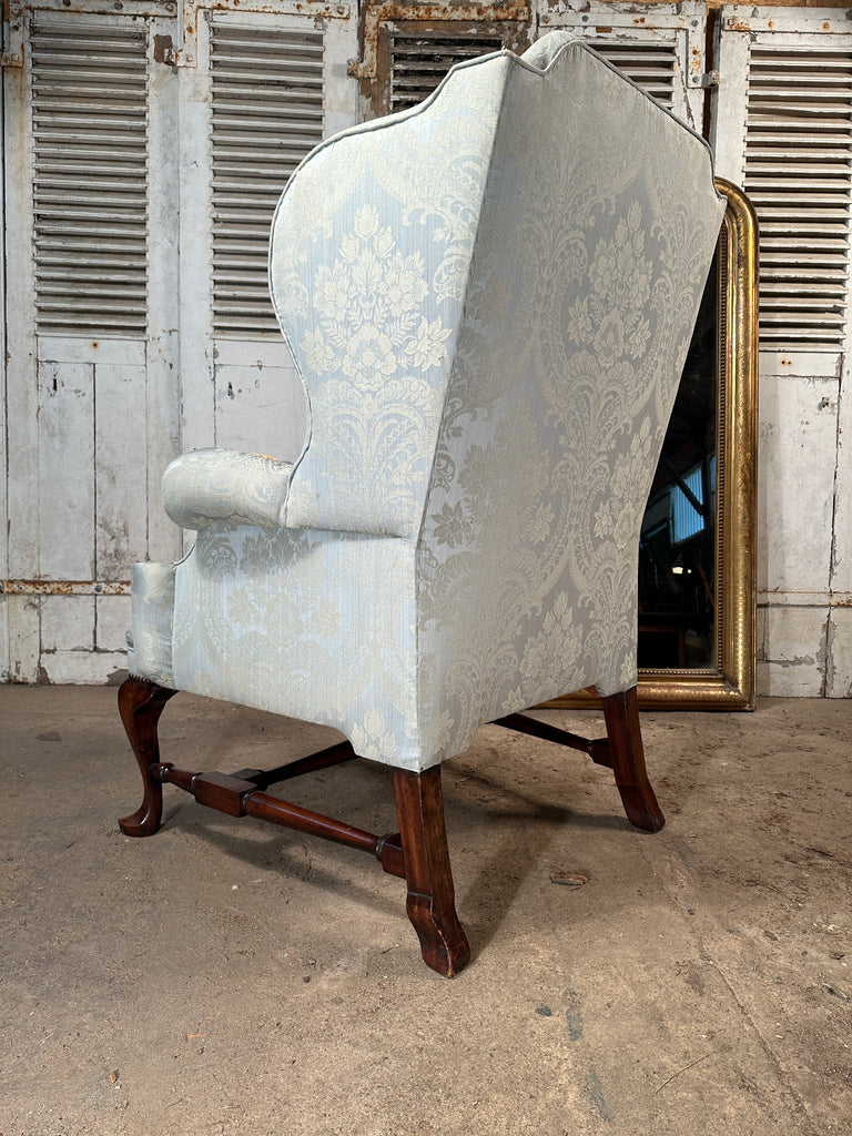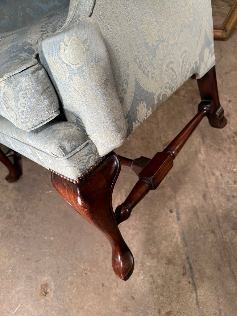 A beautiful antique early Georgian Country House wingback armchair. Beautiful mahogany detailing with carved pad feet with swept rear legs and double cross stretcher. Turned pad arms with shield back rest. Fabulous proportions, exceptionally comfortable. The shape and feet say it all. Georgian fabric below the current country house upholstery with horsehair stuffing. Circa 1820. Inject style into any setting with this fabulous classic library/fireside chair. Wear to current upholstery, see images. We offer in house upholstery service if required, please ask for further details/costs.