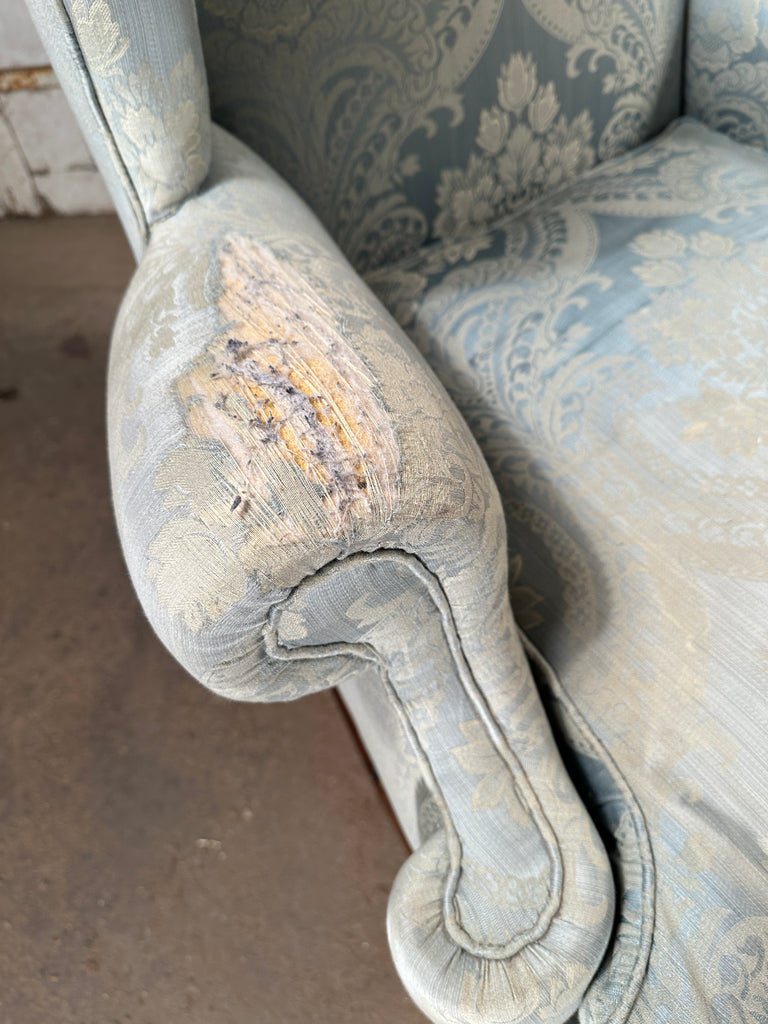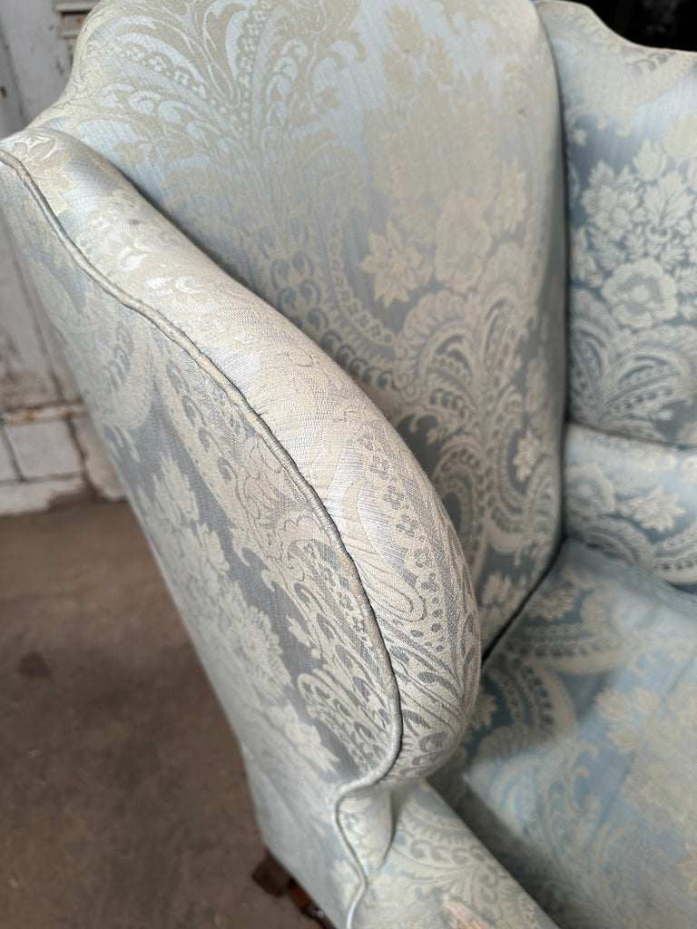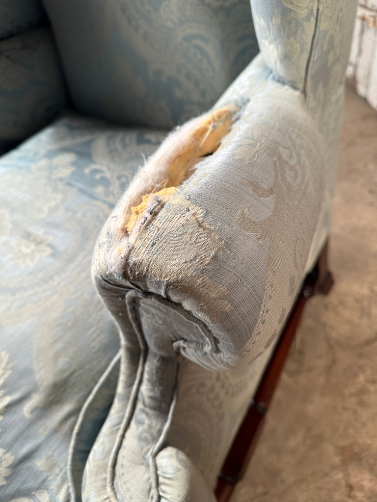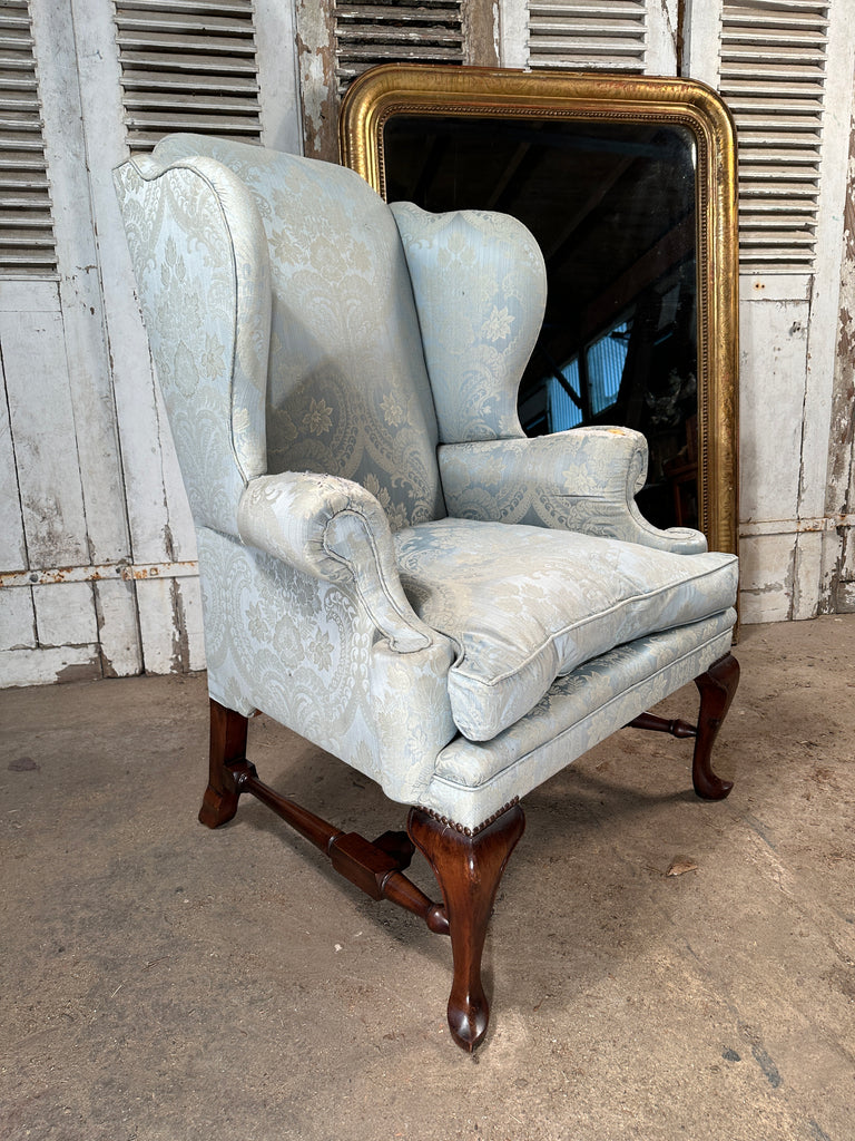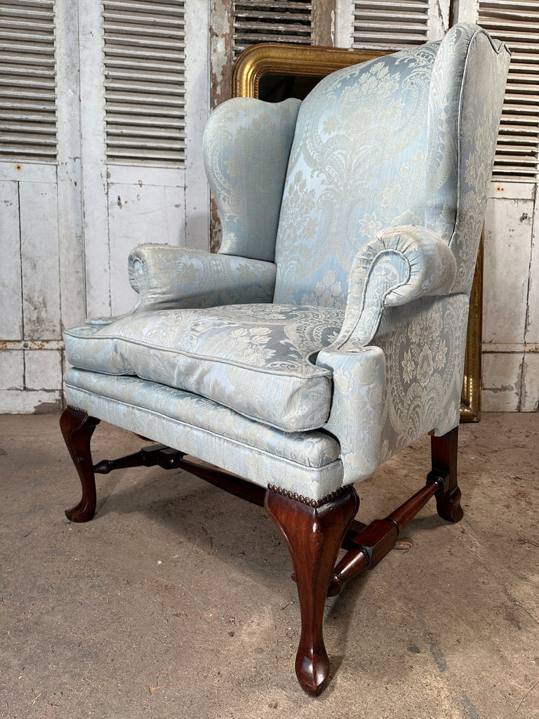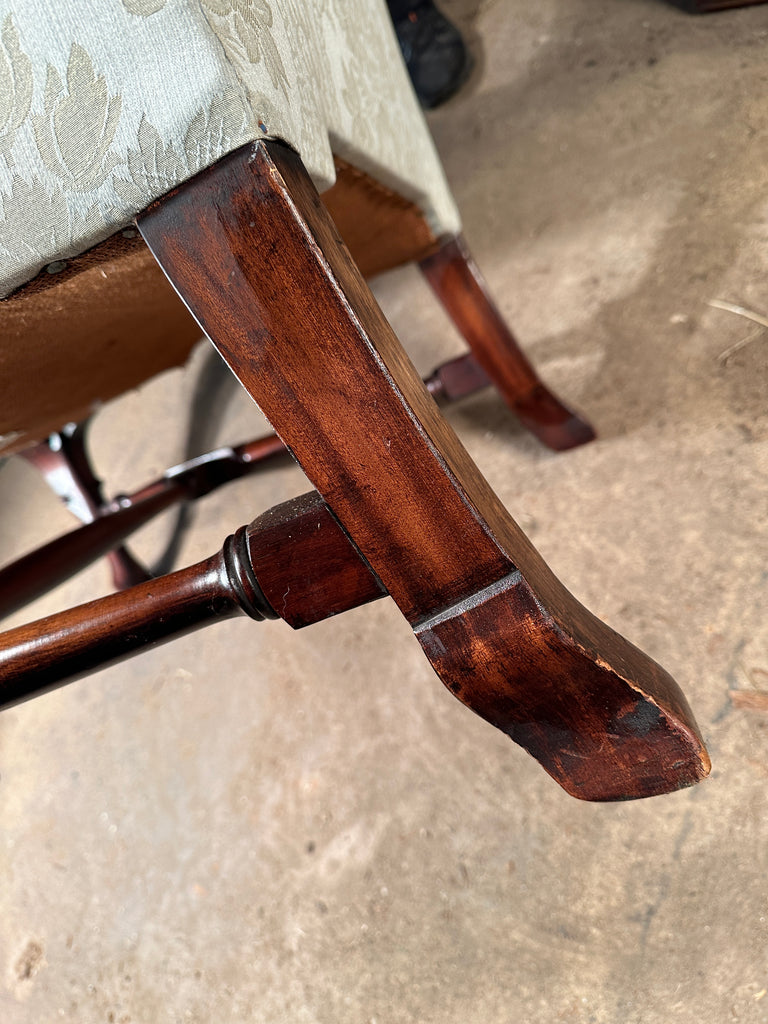 A beautiful antique early Georgian Country House wingback armchair. Beautiful mahogany detailing with carved pad feet with swept rear legs and double cross stretcher. Turned pad arms with shield back rest. Fabulous proportions, exceptionally comfortable. The shape and feet say it all. Georgian fabric below the current country house upholstery with horsehair stuffing. Circa 1820. Inject style into any setting with this fabulous classic library/fireside chair. Wear to current upholstery, see images. We offer in house upholstery service if required, please ask for further details/costs.