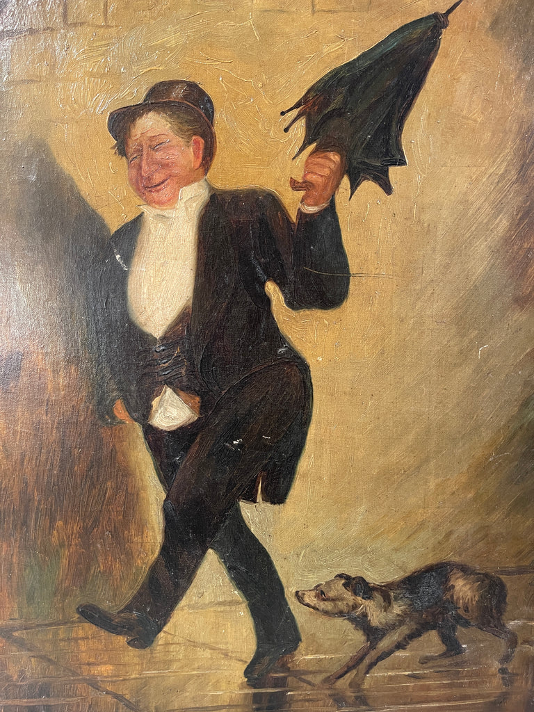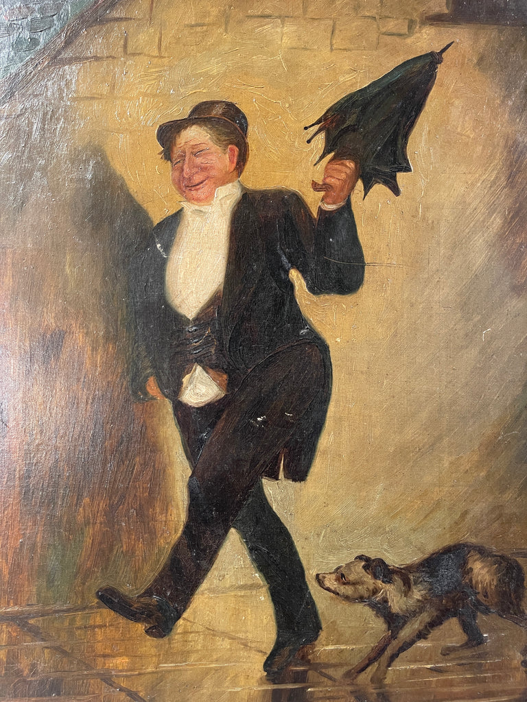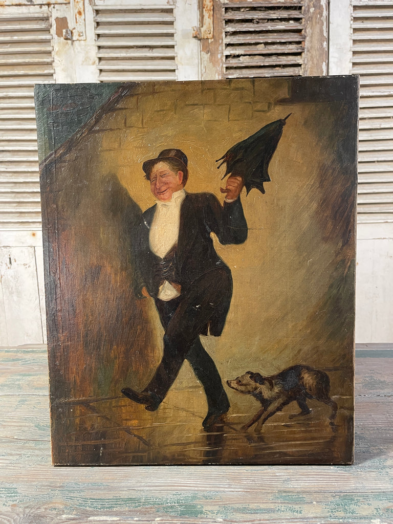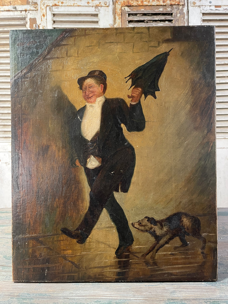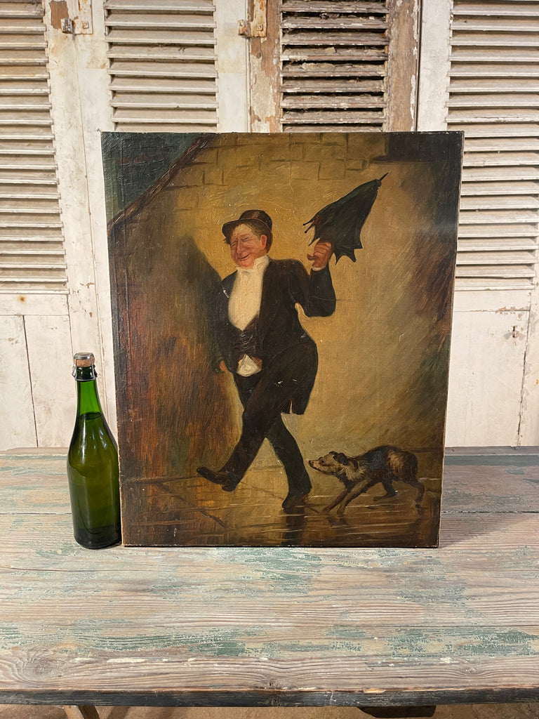 A beautiful antique early Irish School naive oil painting. A great decorative piece of art. A jovial male on his way back no doubt from a public house, walking in the rain past a Croft style house with his trusty hound/dog looking on apprehensively as to his masters well being. A real fun and folk piece of art capturing the spirit. The painting has been remounted at some point by an experienced art restorer at we would imagine great expense as has been done exceptionally well. It has also been re stretched when remounted indicating that this has been a prized painting/ possession of note. We have not researched the painting yet, but simply love the story and folk style application of the artist of his subjects. Dating from around 1890 this oil on canvas is the perfect decorators piece to inject style and a talking point to any room.