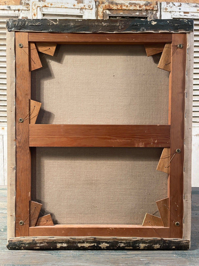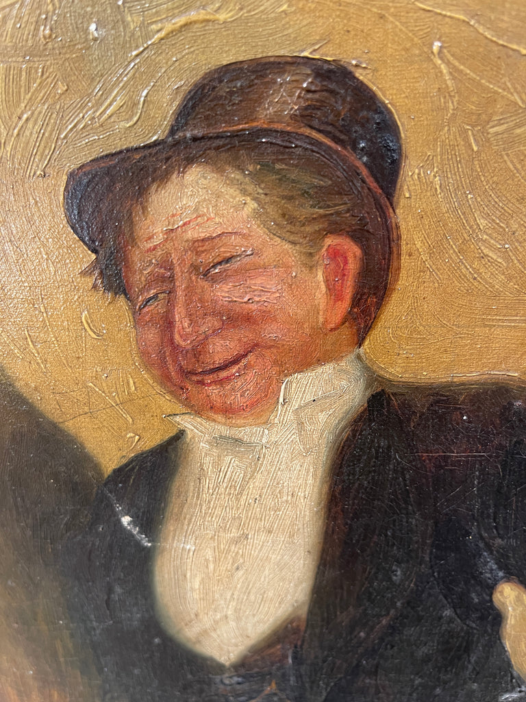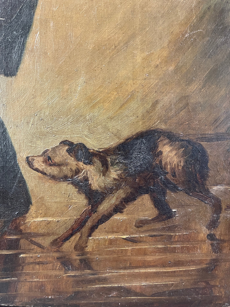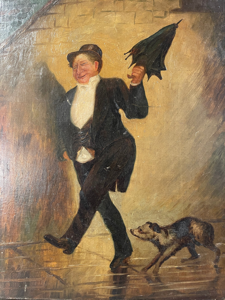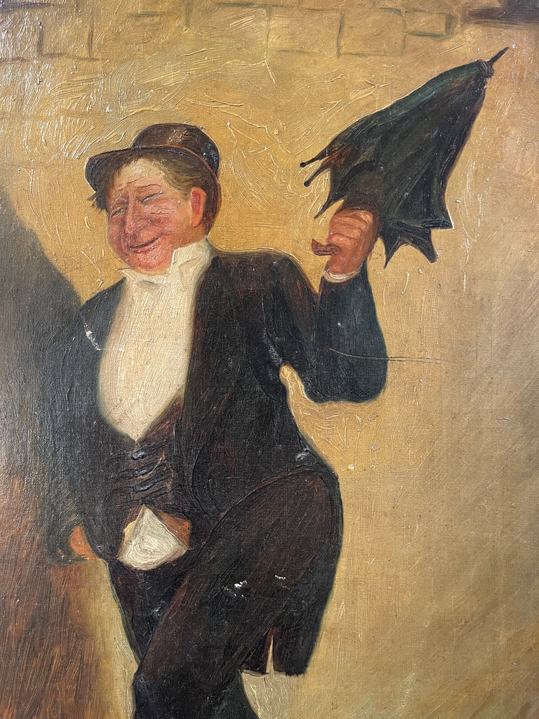 A beautiful antique early Irish School naive oil painting. A great decorative piece of art. A jovial male on his way back no doubt from a public house, walking in the rain past a Croft style house with his trusty hound/dog looking on apprehensively as to his masters well being. A real fun and folk piece of art capturing the spirit. The painting has been remounted at some point by an experienced art restorer at we would imagine great expense as has been done exceptionally well. It has also been re stretched when remounted indicating that this has been a prized painting/ possession of note. We have not researched the painting yet, but simply love the story and folk style application of the artist of his subjects. Dating from around 1890 this oil on canvas is the perfect decorators piece to inject style and a talking point to any room.