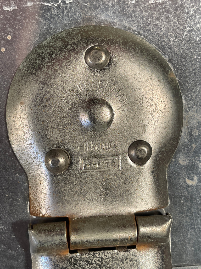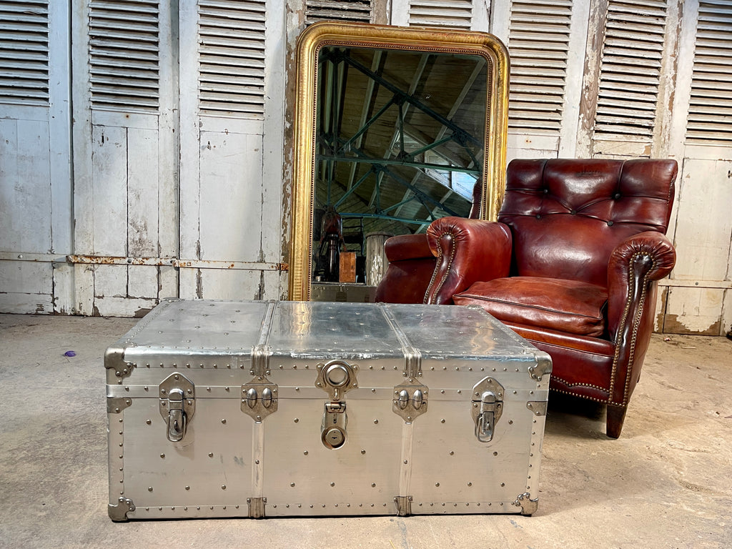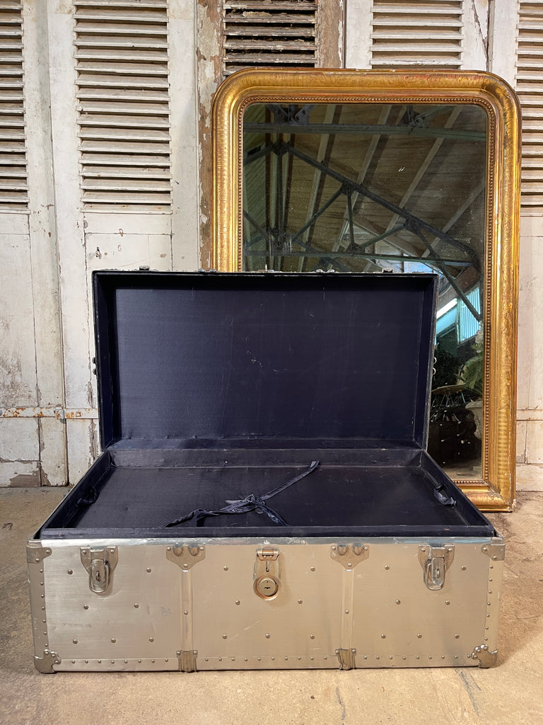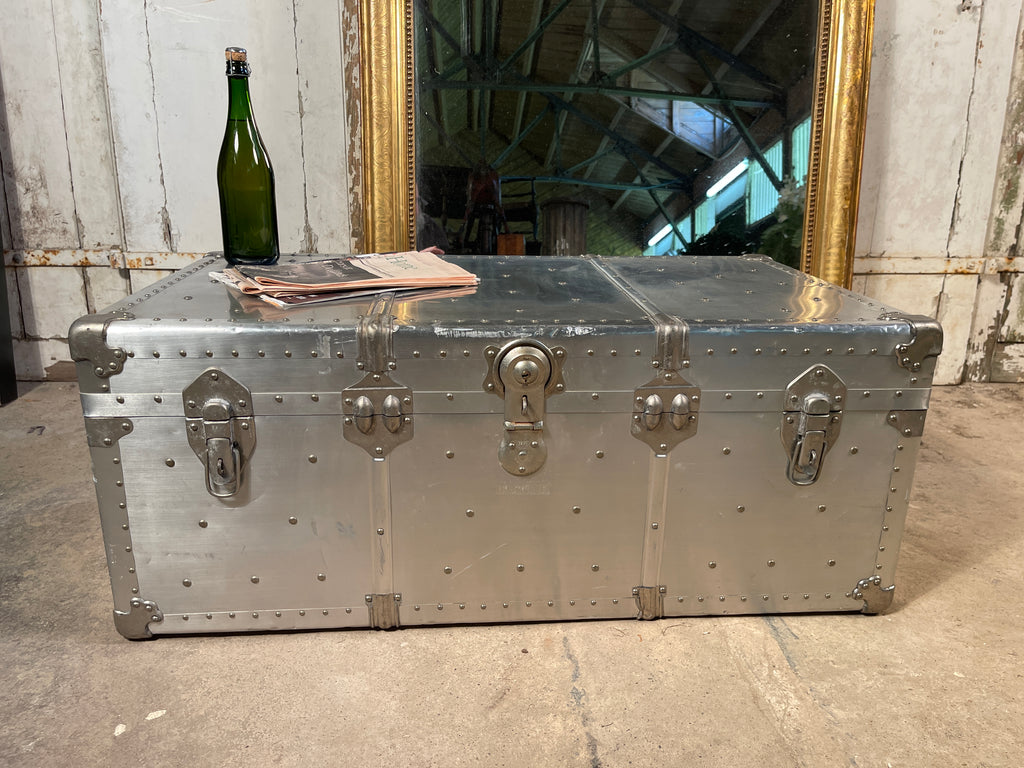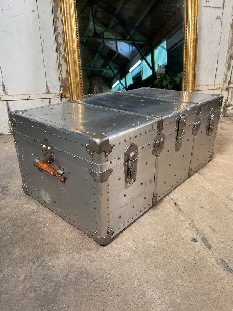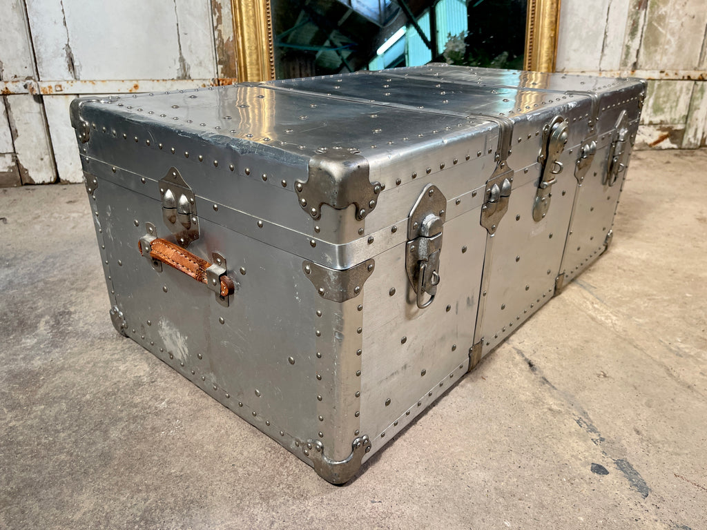 A fabulous antique aluminium/metal flight/steamer travel trunk. Iconic 1940’s design, so of the time of magnificent flying machines and travels by sea voyage. This is all original and the rare maker of Albana, stamped with serial number. Original leather side carry handles and deep blue silk liner with intact upper shelf. Riveted construction with corner guards. A fabulous survivor, the perfect coffee table or end of bed storage etc. An iconic design classic.