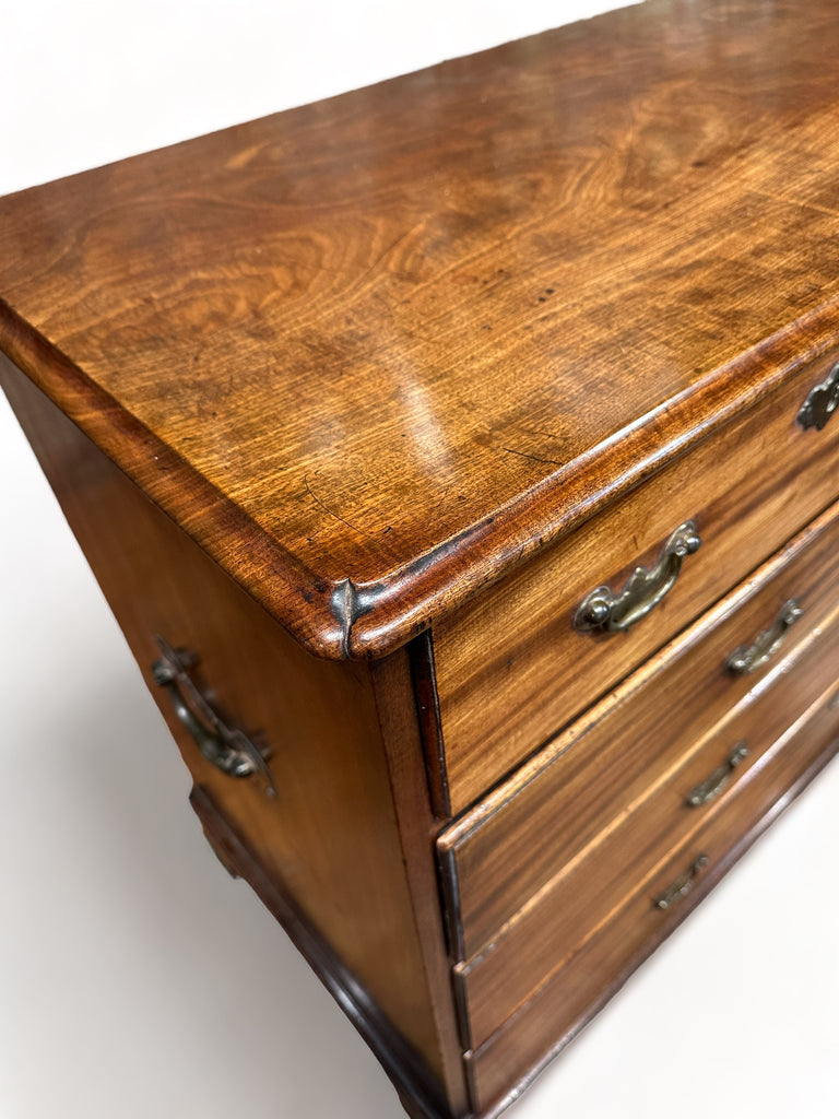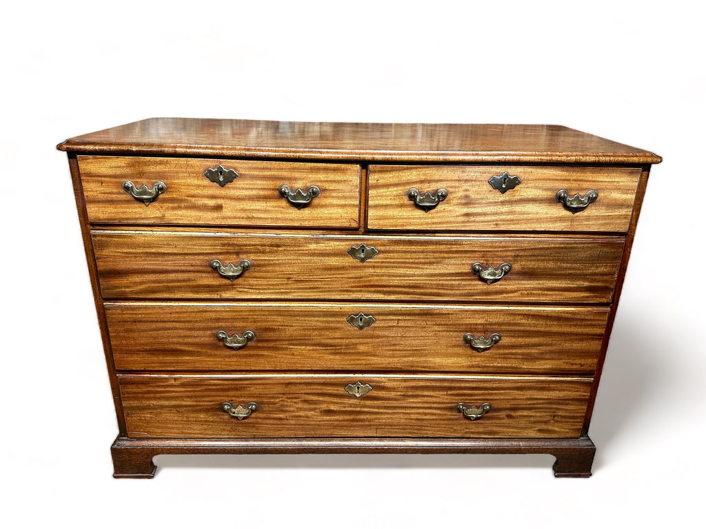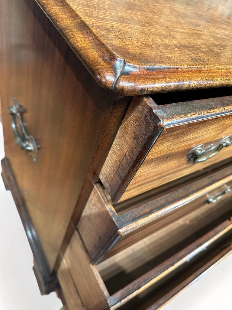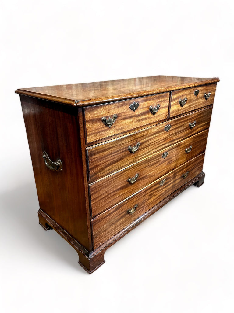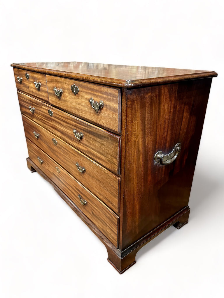 An absolutely stunning antique Yorkshire Country House house keepers George Il Cuban Mahogany Chest Of Drawers. Exceptional quality with carved cheek detailing to thick single plank Cuban Mahogany top. Originating from the West Yorkshire area of Otley synonymous with Thomas Chippendale this rare piece of commissioned furniture is a one of a kind. All original brass drop handles with carry handles to side. Large oversize brass inset castors to under profiled bracket feet. Single plank dovetailed drawer liners.Rare oversize/larger size that would of been used by the housekeeper, brass inset wheels and carry handles for easy moving. Dating from circa 1750 this chest is superior in every aspect. We haven't seen anything near this quality for years. Numerous dealers who have seen this in situ real time have commented on the extraordinary craftsmanship and quality. We love it, coming home with us until it finds it's forever home.